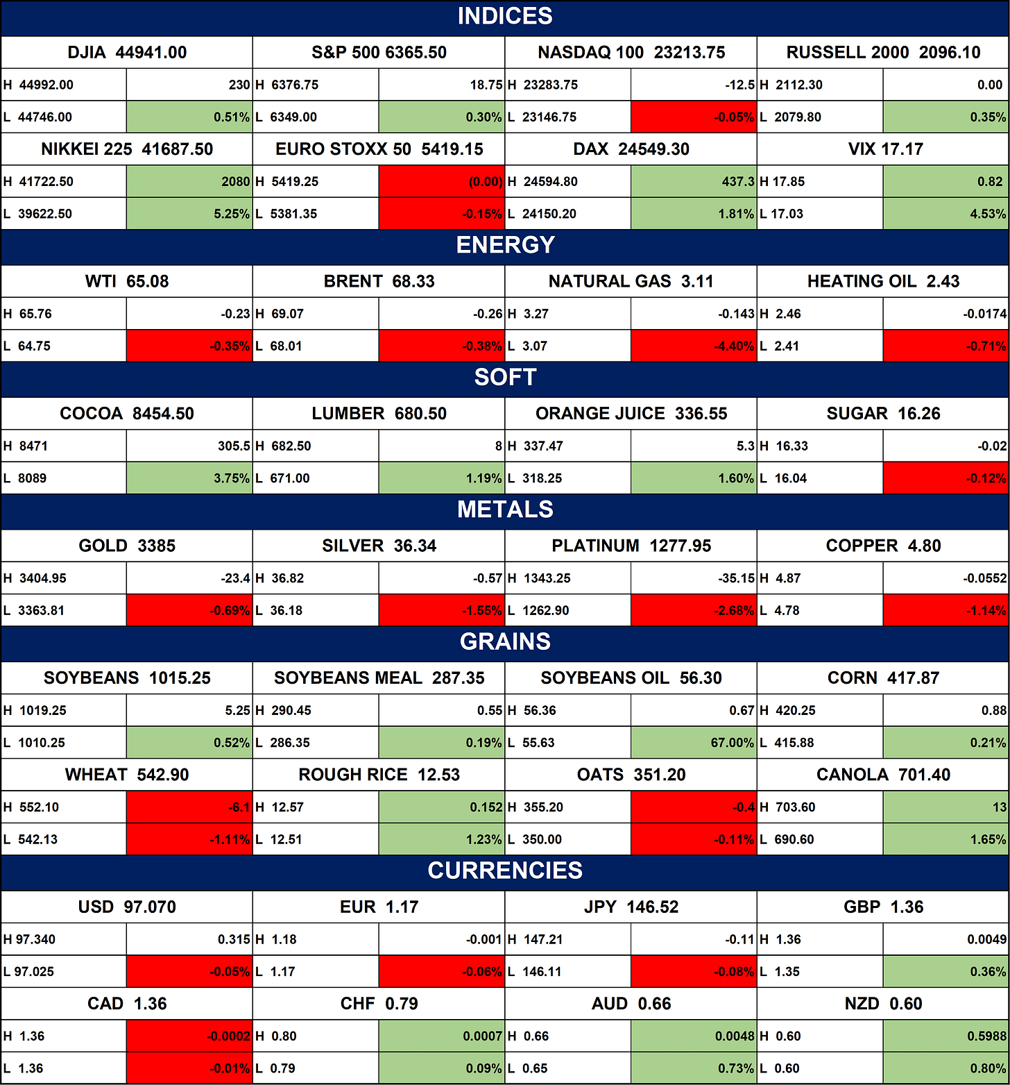 The table below depicts that the global stocks were mostly higher, led by a strong Nikkei gain. Energy and metals prices dropped, while soft commodities rose, especially cocoa. Grains were mixed, and the US dollar was slightly weaker, with minor gains in AUD and NZD. Overall, equities stayed firm despite broad commodity weakness.