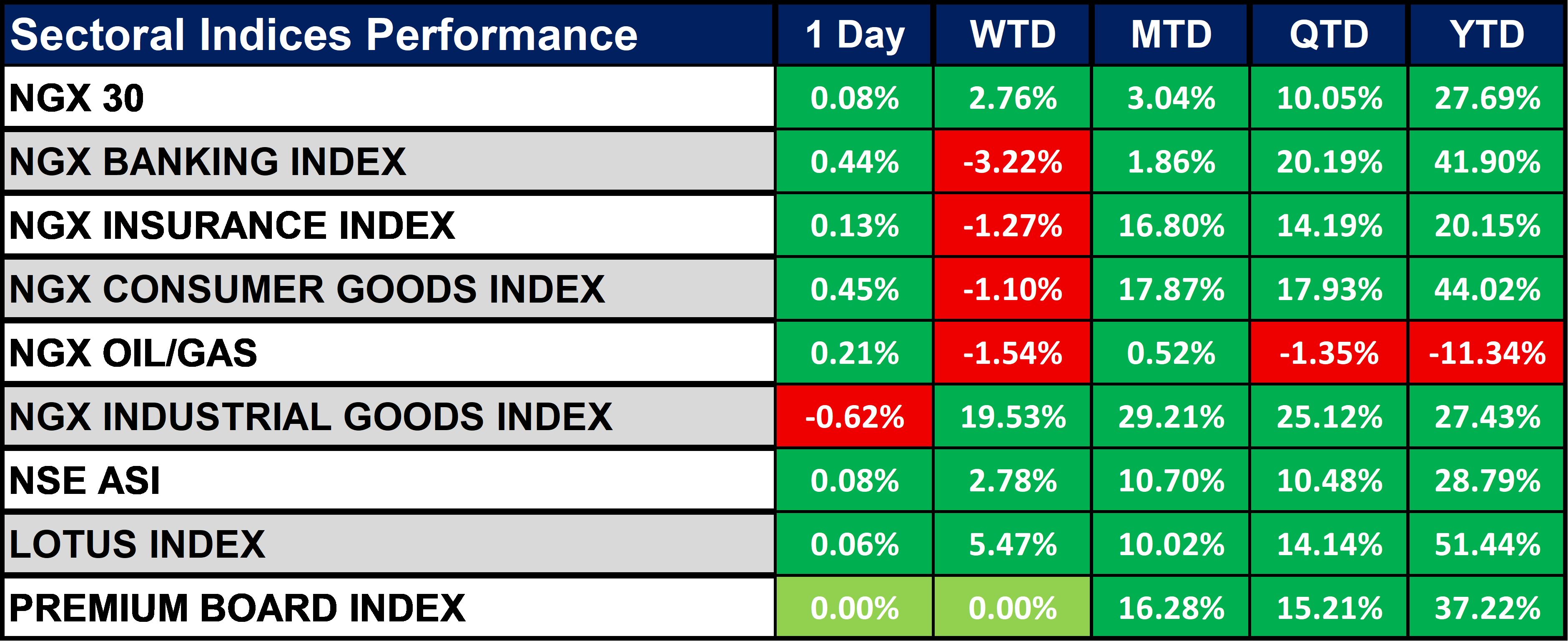 The Nigerian stock market extended gains on Tuesday, adding ₦396billion in market capitalization as the All-Share Index rose 0.71% to 99,793.71 points, driven by large-cap stocks like Dangote Cement, BUA Cement, and MTN Nigeria. 36 stocks gained, led by Dangote Sugar (+10%), while 34 declined, with Ellah Lakes (-10%) topping losers. Trading volume fell 47.7% to 408.62 million shares valued at ₦7.83billion. The Industrial Goods Index led sectoral gains, up 2.87% weekly and 28.23% YTD. - Punch