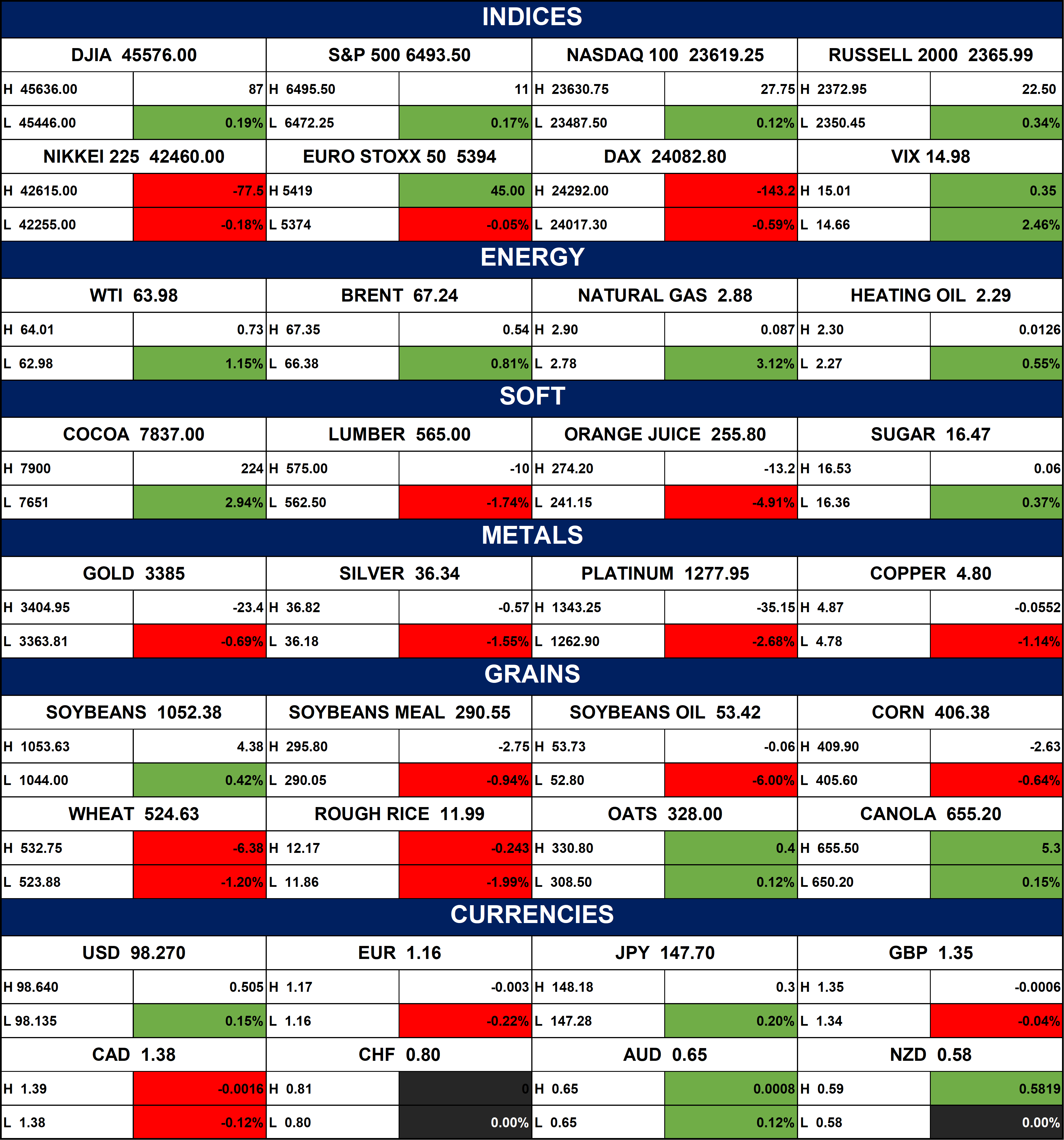 The table below depicts that the markets were mixed overall. U.S. indices rose slightly, while European and Asian markets fell. Energy was strong, especially Natural Gas, while metals and grains mostly declined. Cocoa surged, but Orange Juice dropped sharply. In currencies, the USD, JPY, and NZD gained, while the EUR and GBP slipped.