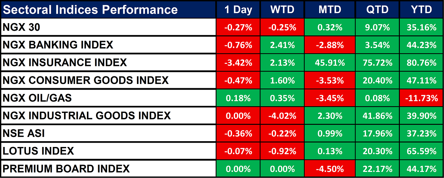 The table below shows that most NGX sector indices declined today, led by the Insurance Index (-3.42%). Only the Oil/Gas Index posted a gain (+0.18%). Despite the daily losses, year-to-date performance remains strong across most sectors, especially Insurance (+80.76%), Lotus (+65.59%), and Consumer Goods (+47.11%). The only sector in negative territory for the year is Oil/Gas (-11.73%).