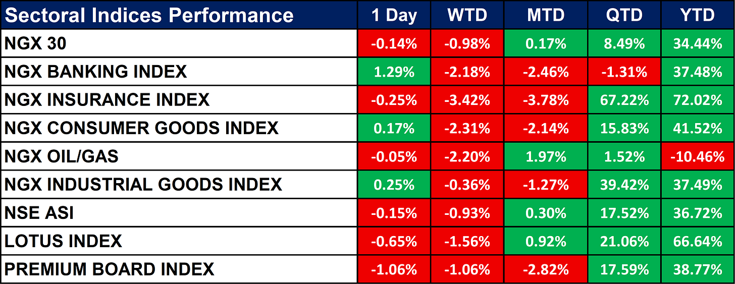The table below shows that the NGX sectoral indices reflect short-term weakness but strong long-term performance. Most sectors posted daily and weekly declines, showing near-term market pressure. However, year-to-date returns remain robust, with Insurance (+72%) and Lotus Index (+67%) leading gains, while Oil/Gas (-10%) is the only major laggard.