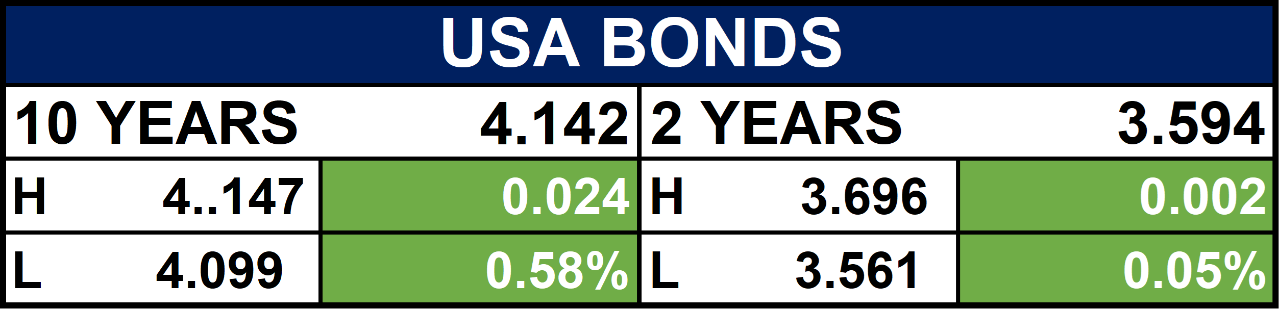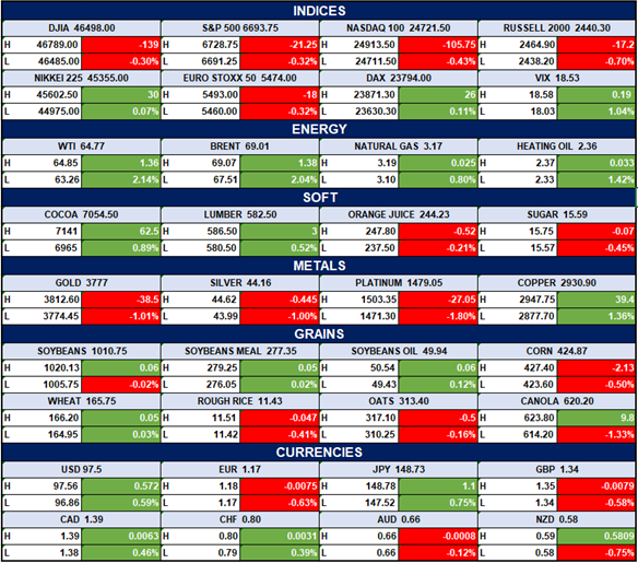 The table below depicts that the Global markets showed mixed performance. U.S. indices such as the S&P 500, NASDAQ, and Russell 2000 posted declines, while the DJIA and DAX recorded slight gains. In commodities, energy prices (like Brent and WTI crude) moved higher, but precious metals (gold, silver, platinum) saw notable drops. Grain markets were mixed, with soybeans rising while corn and oats fell. Currency markets remained relatively stable, with minor fluctuations in the USD, EUR, and JPY.