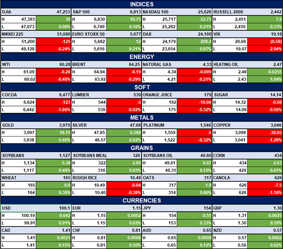 The table below depicts that the Global equities were mostly positive, with major indices including the Nasdaq 100, S&P 500, and DAX posting gains, while volatility (VIX) edged lower. Energy commodities were mixed as WTI and Brent slipped, but Natural Gas ticked up slightly; soft commodities saw sharp declines, particularly Orange Juice and Cocoa. Metals was mixed and grains broadly strengthened. Most agricultural commodities posting gains, while currencies traded largely flat with mild movements across major pairs.