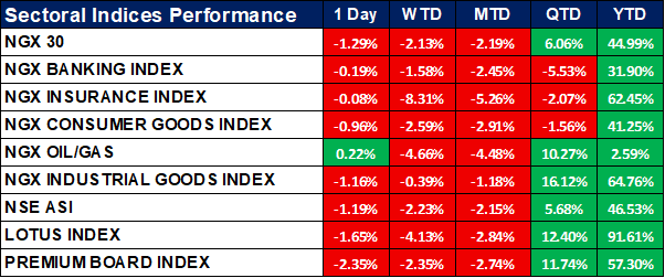 The table below shows that the NGX market closed lower as most sector indices recorded declines, with the NGX 30, Banking, Consumer Goods, and Industrial Goods indices all down on a 1-Day and Month-to-Date basis.