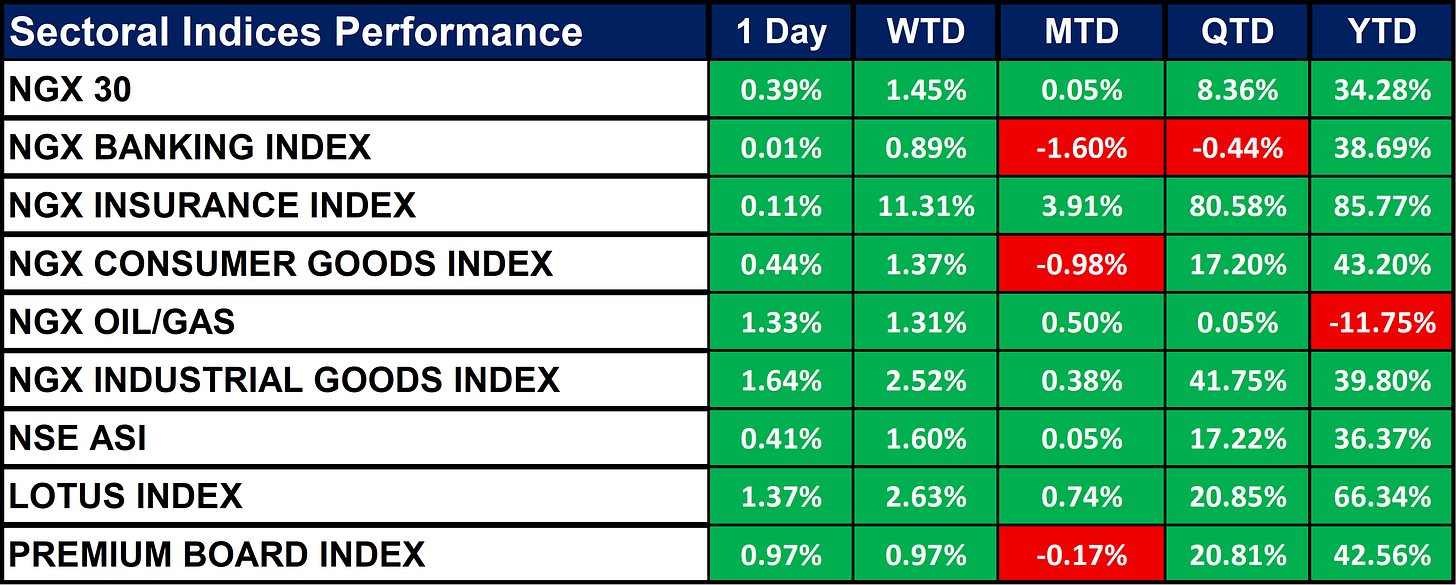 The table below shows that the NGX sector indices show broad gains across most sectors. Insurance (+85.77% YTD), Lotus (+66.34% YTD), and Industrial Goods (+39.8% YTD) are the strongest performers. The Oil/Gas index (-11.75% YTD) is the only major laggard. Overall, the market remains positive with the NSE ASI up 36.37% YTD, reflecting solid momentum led by Insurance and Industrial sectors.