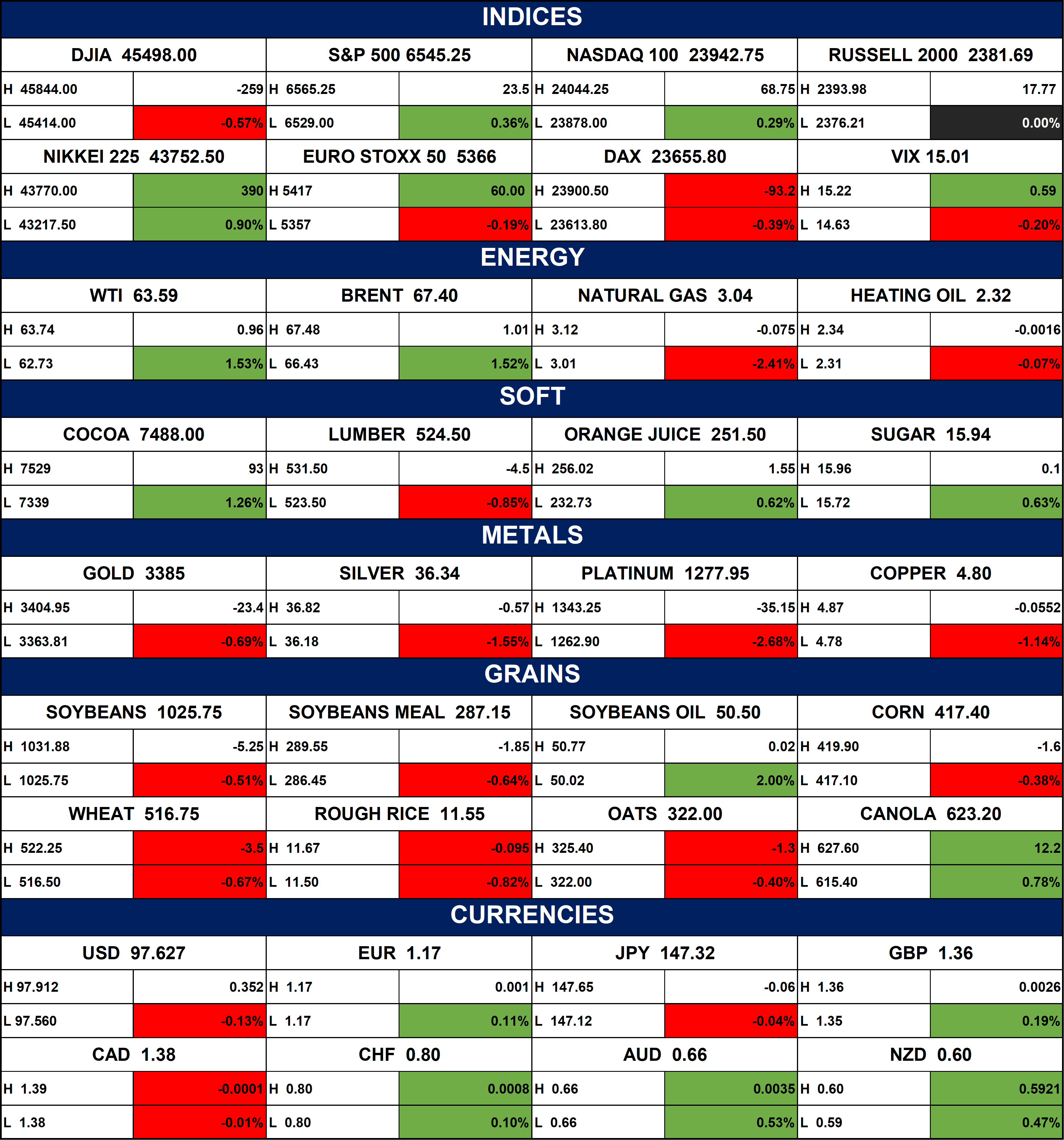 The table below depicts that the Global markets were mixed: U.S. equities were flat, Japan’s Nikkei gained, while Germany’s DAX slipped. Oil prices rose, natural gas fell, and soft commodities like cocoa and sugar advanced. Metals and most grains weakened, with only small gains in soybean oil and canola. The U.S. dollar eased, while euro, pound, and commodity-linked currencies strengthened.