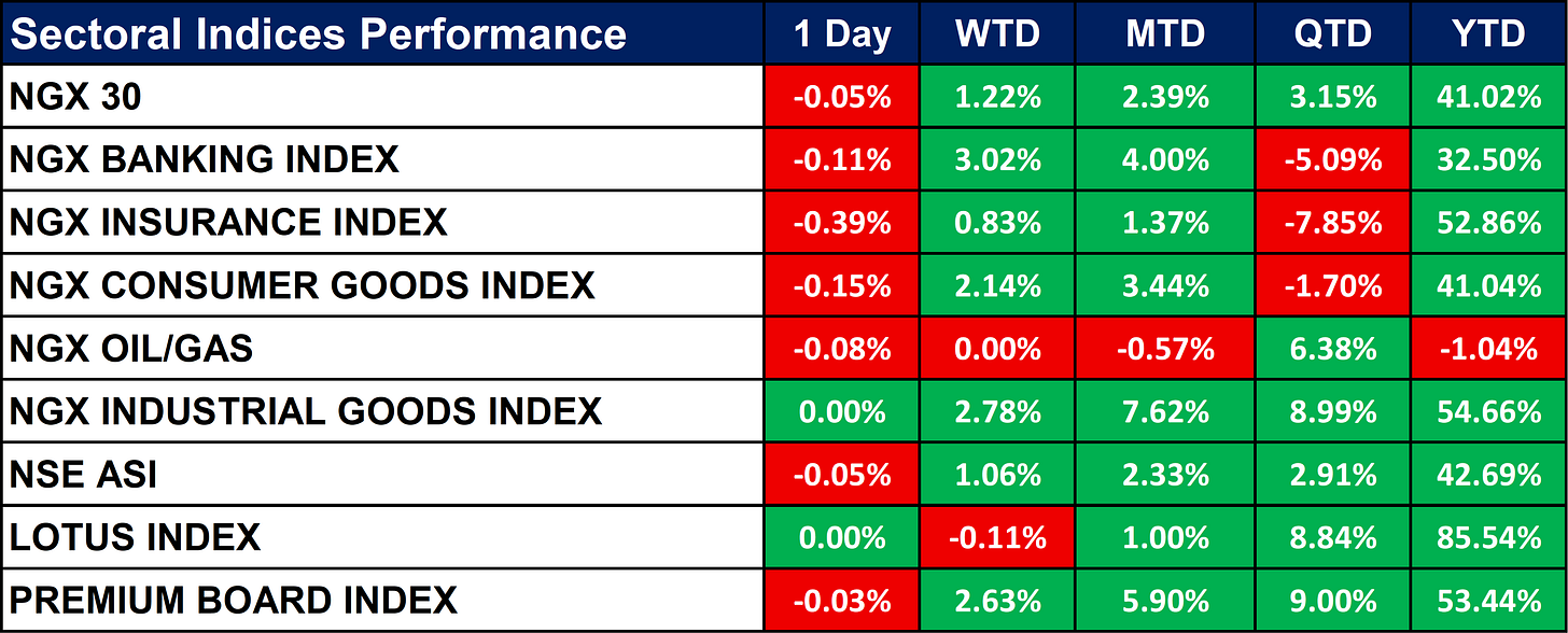 The table below shows that the market was broadly negative on the day, with most NGX sector indices posting mild declines. Week-to-date and month-to-date performance remain positive across nearly all sectors, led by Industrial Goods and Consumer Goods. Year-to-date, the market shows strong gains overall, with standout performances from the LOTUS Index (+85.54%) and Insurance (+52.86%).