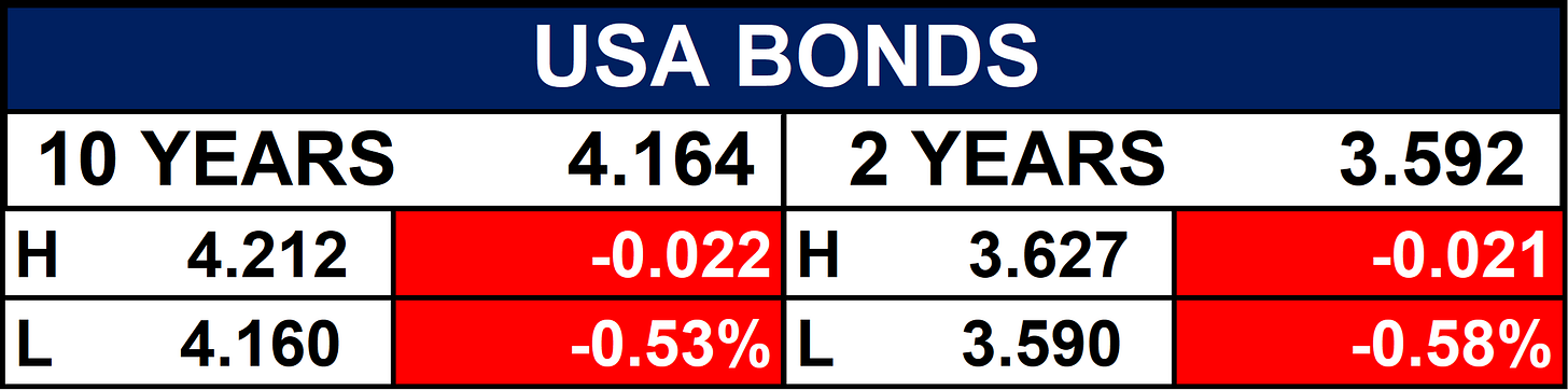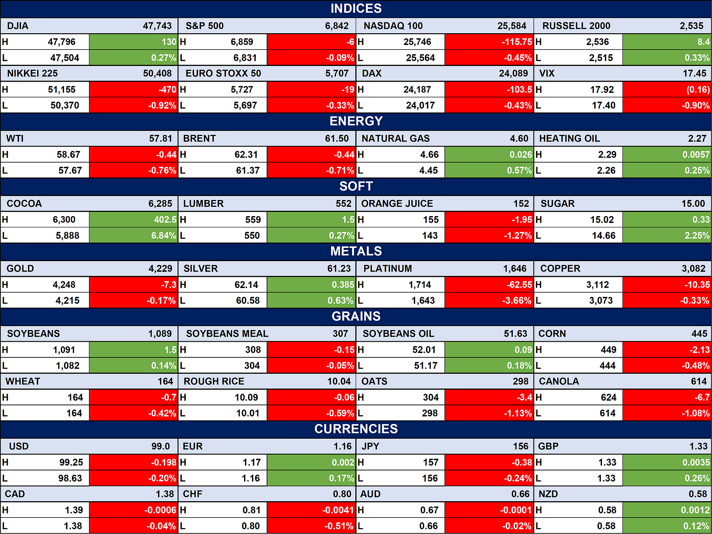 The table below depicts that the Equities showed mixed performance, with U.S. indices slightly lower while the Russell 2000 posts a small gain; volatility (VIX) is marginally down. Commodities are broadly mixed: energy prices are slightly lower, metals show mild weakness, while soft commodities like cocoa and sugar edge higher. Currencies trade mostly flat to slightly weaker, with minor moves across USD, EUR, JPY, and GBP.