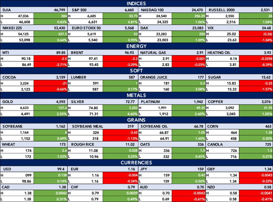 Global markets showed strength, with major indices like the S&P 500 and Nasdaq posting solid gains, while volatility eased as the VIX declined. Energy commodities weakened broadly, led by drops in crude oil and heating oil, while metals surged, with gold and silver recording notable gains. Agricultural commodities were mixed, as gains in grains like wheat and corn contrasted with declines in cocoa and sugar, while currency markets remained relatively stable with slight strength in the US dollar and mixed movements across major pairs.
