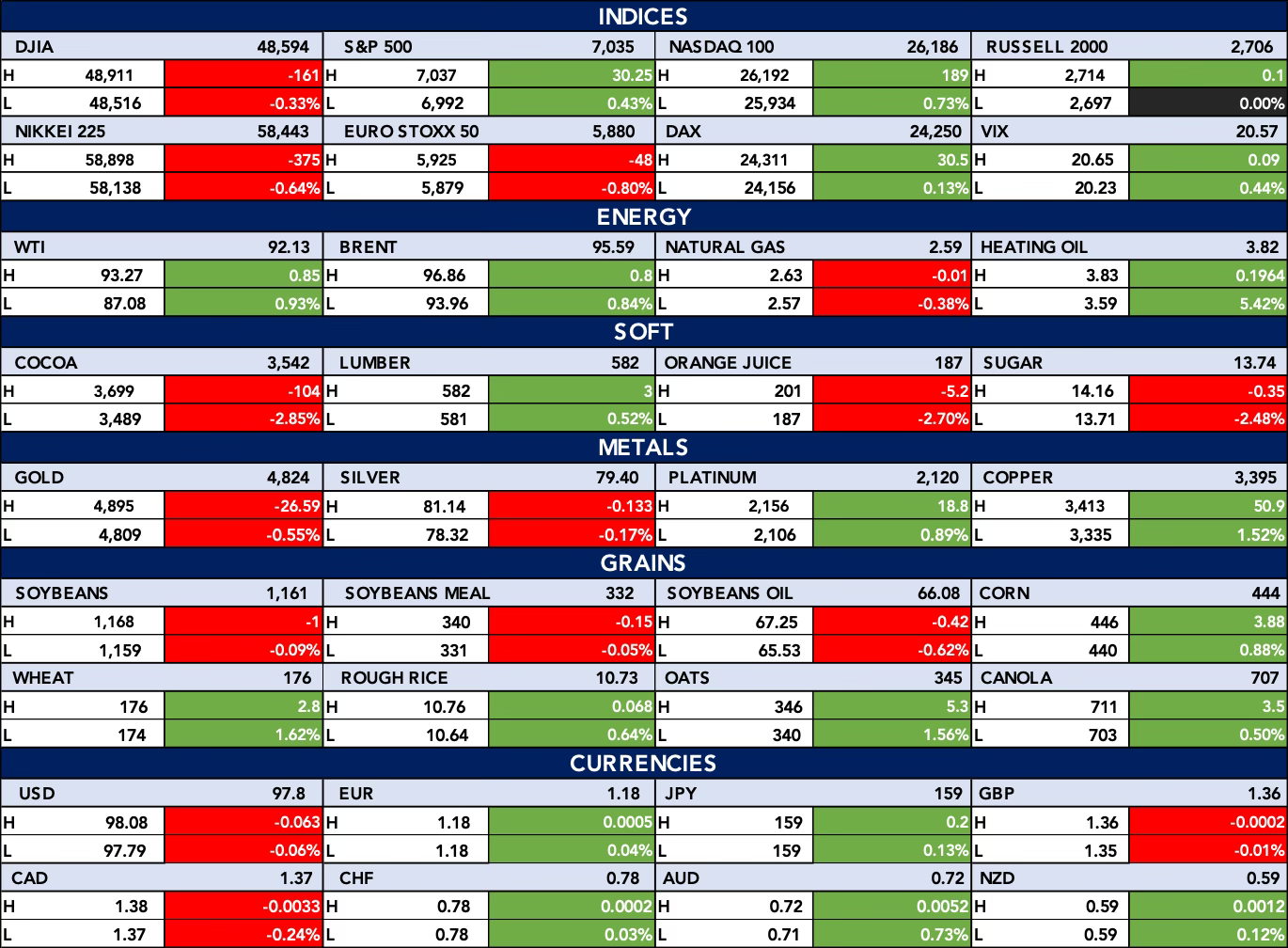 In the table below, Global markets showed a mixed tone, with gains in the S&P 500, Nasdaq, and DAX offset by declines in the Dow, Nikkei, and Euro Stoxx, while volatility edged higher. Energy markets remained firm with crude prices advancing, whereas metals were softer led by declines in gold and silver despite strength in copper and platinum. Agricultural commodities were mixed, and currency markets saw modest dollar weakness alongside selective strength in the euro, yen, and commodity-linked currencies.