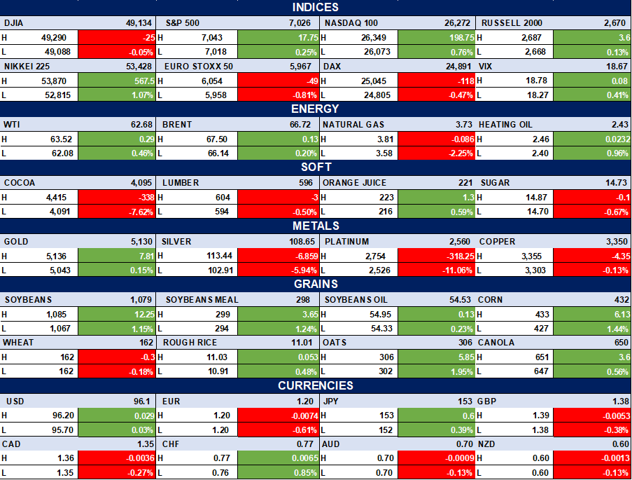 The table below depicts that the Global markets were mixed, with U.S. equities broadly higher (S&P 500 and Nasdaq leading), European indices softer, oil prices firm, precious metals mixed (gold up, silver and platinum down), grains mostly stronger, and currencies relatively stable with a firmer dollar tone.