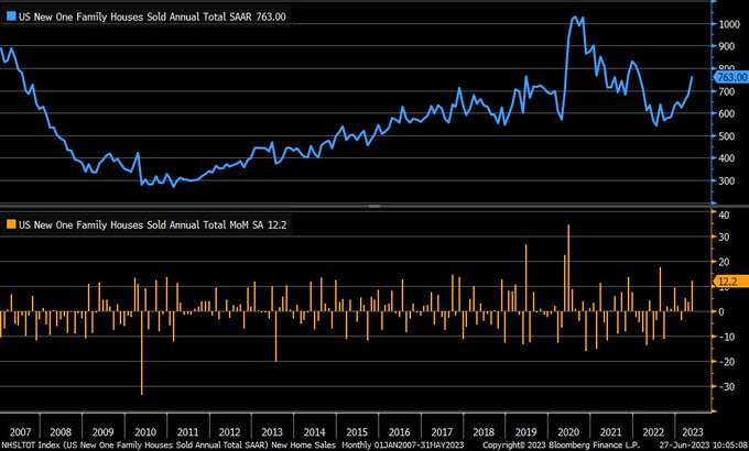 Sales of new US homes increased for the 3rd consecutive month in May, jumping by the most (12.2%) since August 2022 (chart).